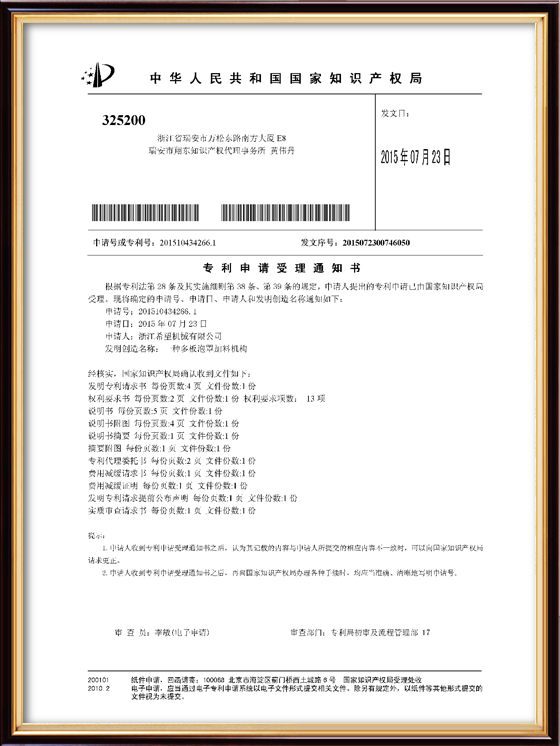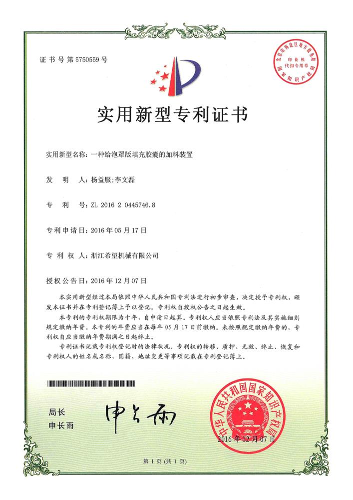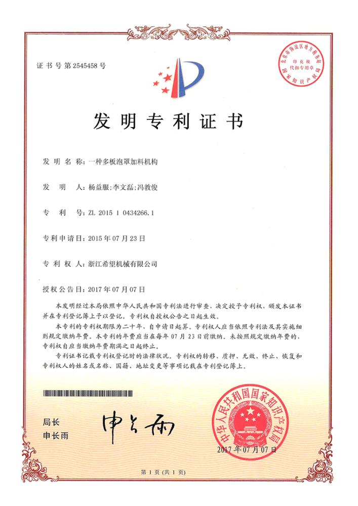 2017年7月7日,公司的“一種多板泡罩加料機(jī)構(gòu)”獲得發(fā)明專利授權(quán),專利號(hào)為ZL201510434266.1。