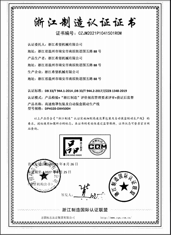 2008年推出全新的適用于化妝品包裝的面膜、眼貼等系列包裝機(jī)及生產(chǎn)線設(shè)備。同年更名為:浙江希望機(jī)械有限公司,注冊(cè)資金500.5萬(wàn)元。