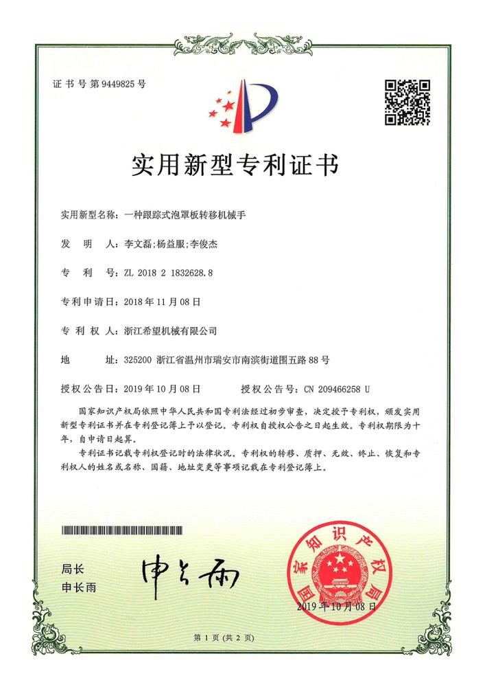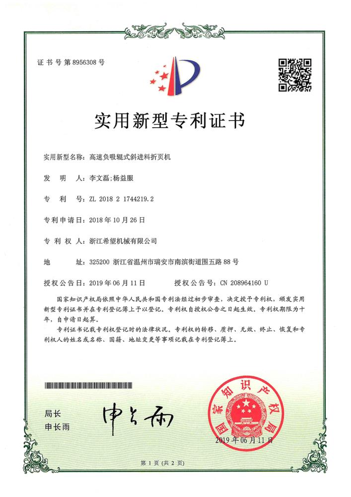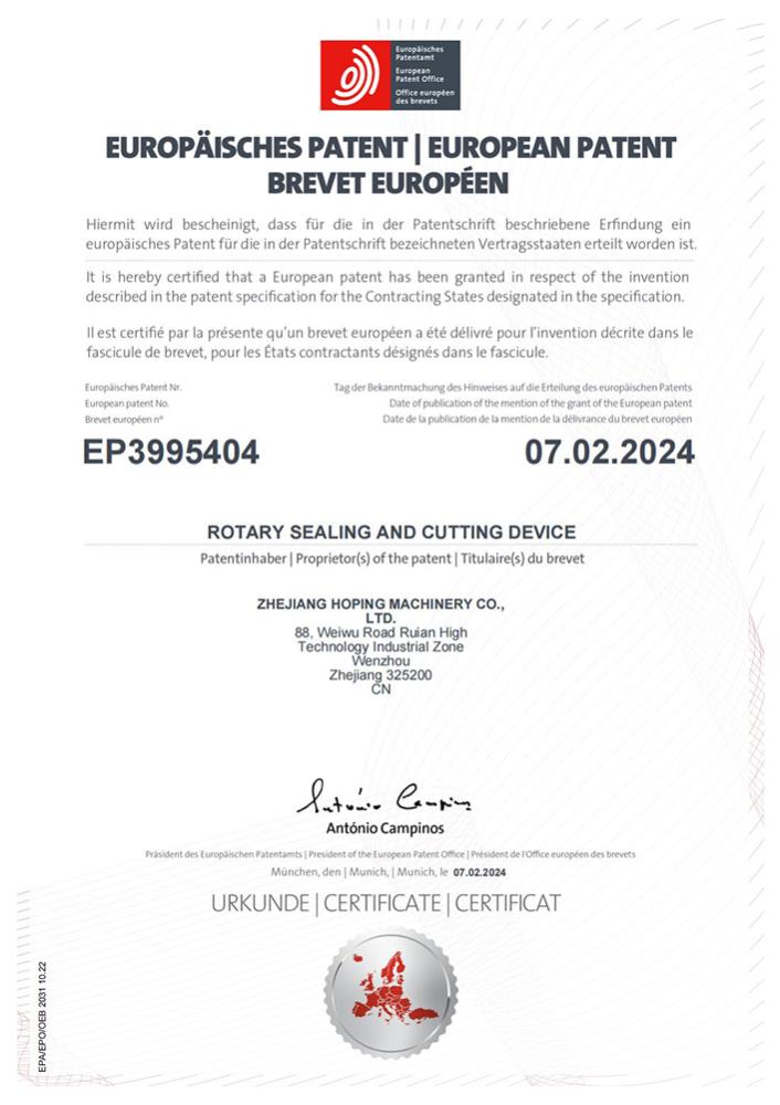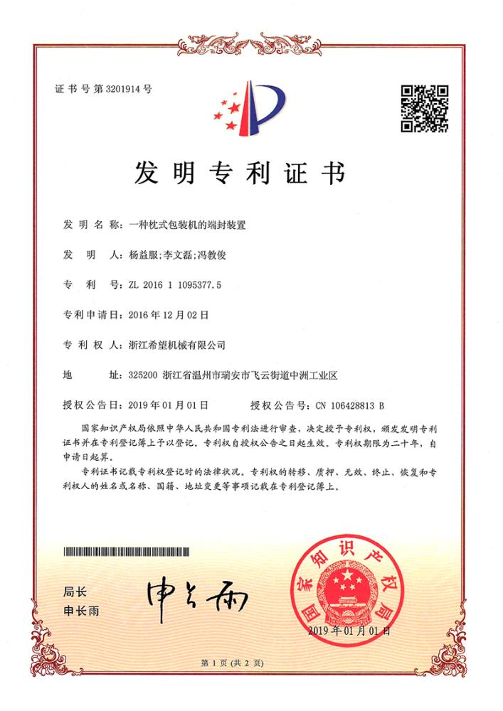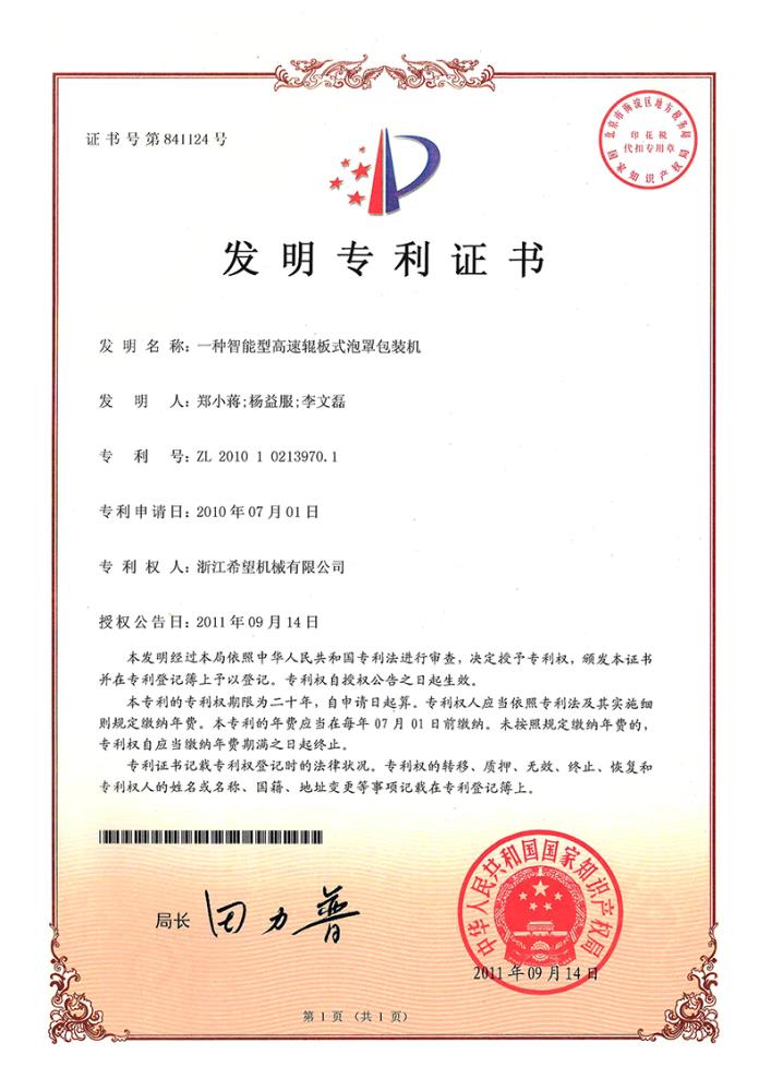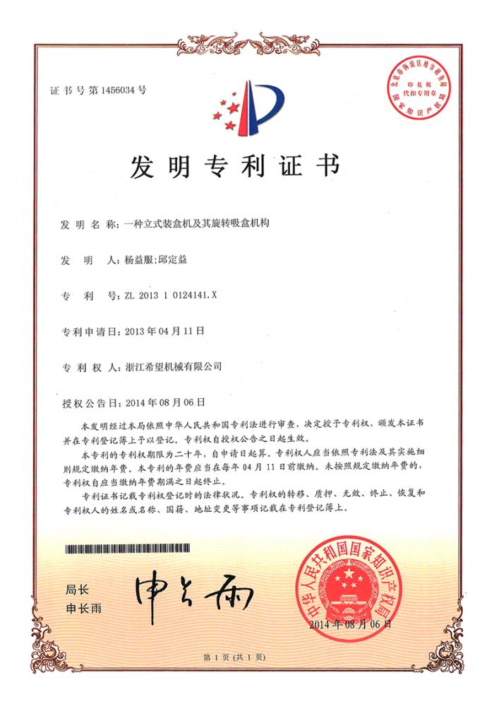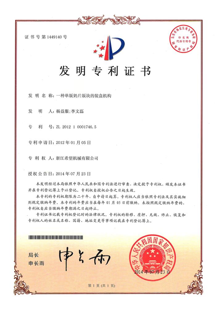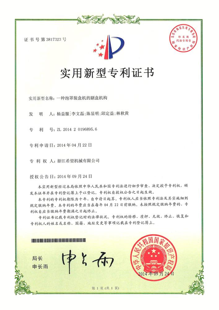 2011年9月14日,公司的“一種上開(kāi)蓋裝盒機(jī)”獲得發(fā)明專利授權(quán),專利號(hào)為ZL01010213996.6。