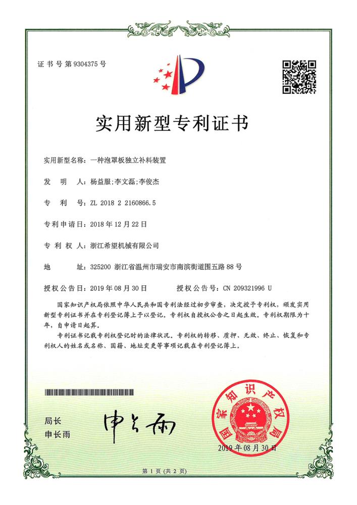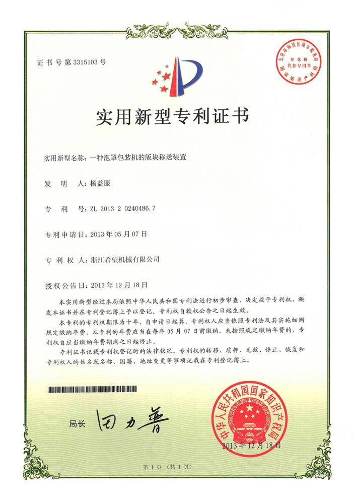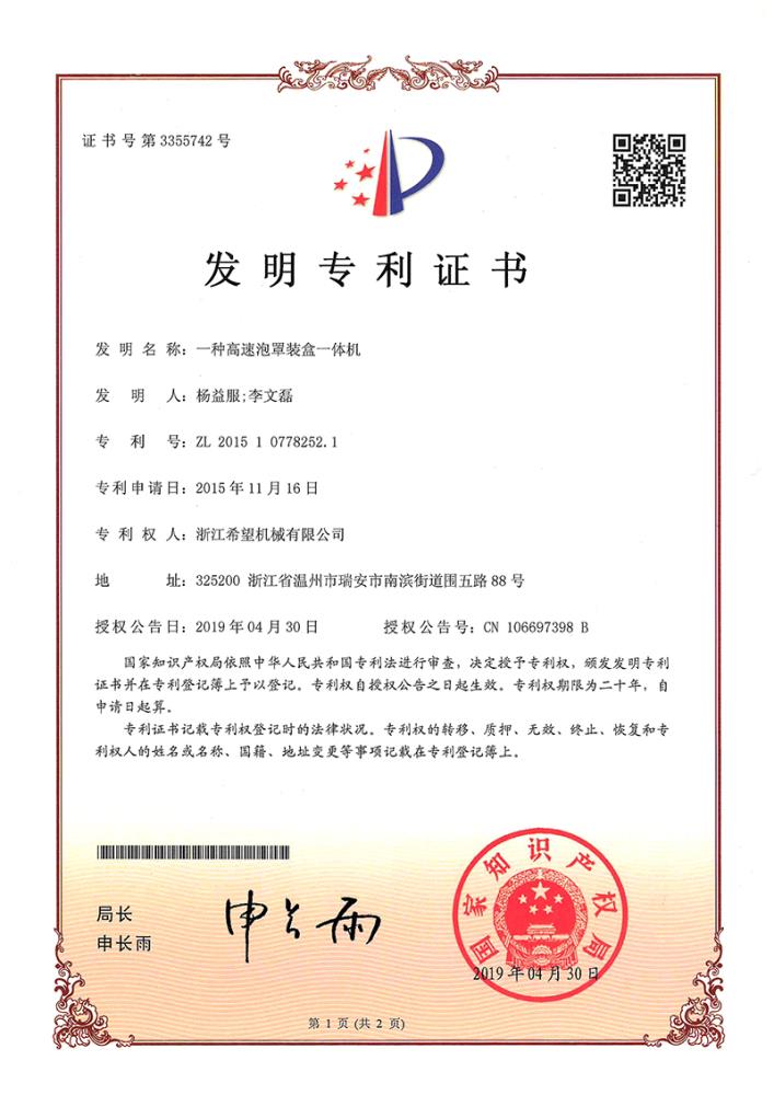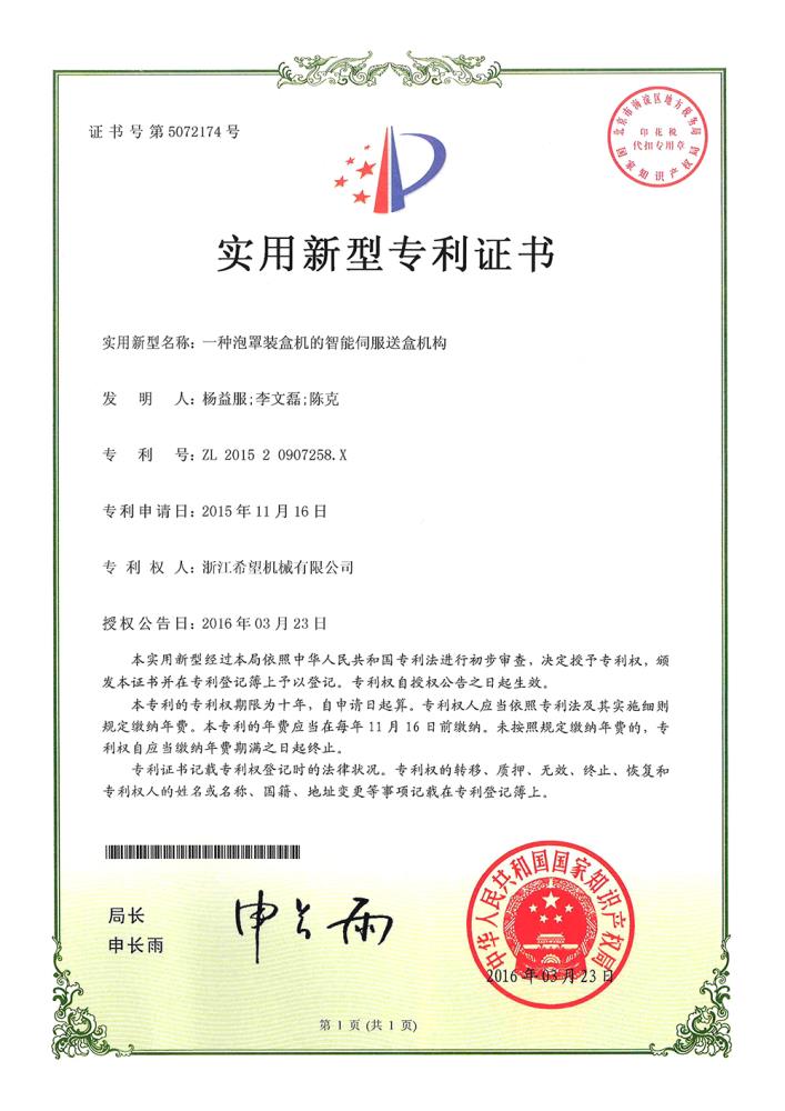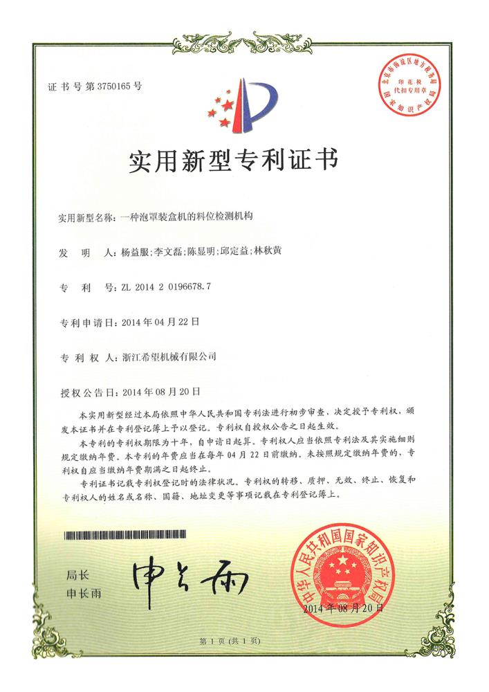 2016年4月6日,公司的“一種泡罩裝盒機(jī)”獲得發(fā)明專利授權(quán),專利號(hào)為ZL201410162188.X。